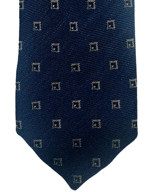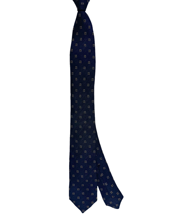 Barba Sevenfold Tie Dark Blue Taupe Geometric Design - Linen Silk